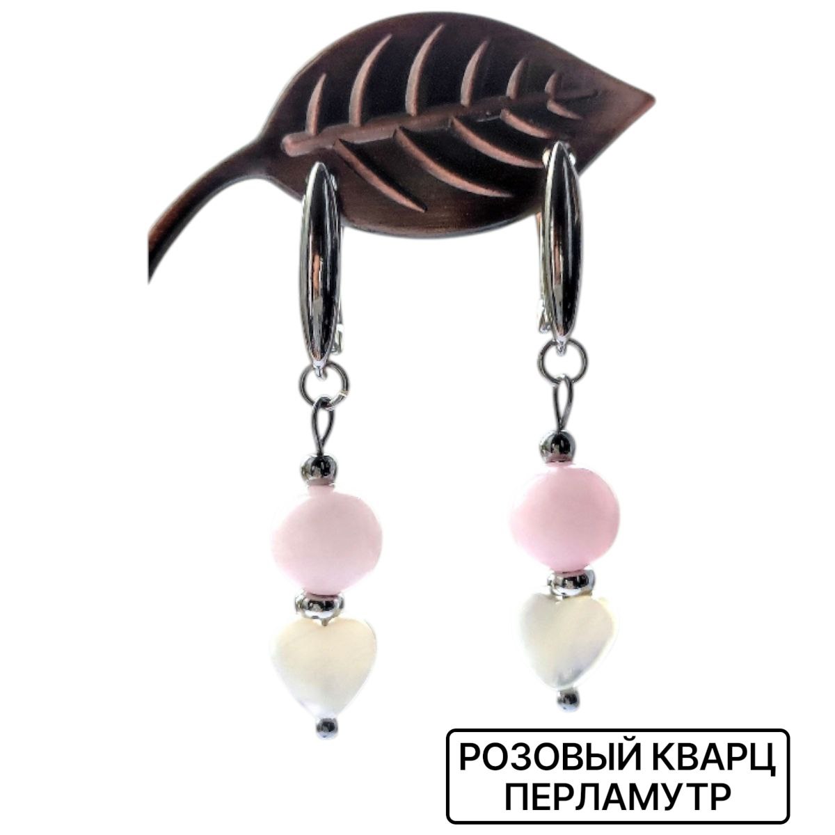 Серьги Шепот сердца из натурального камня розовый кварц и перламутра сердечко